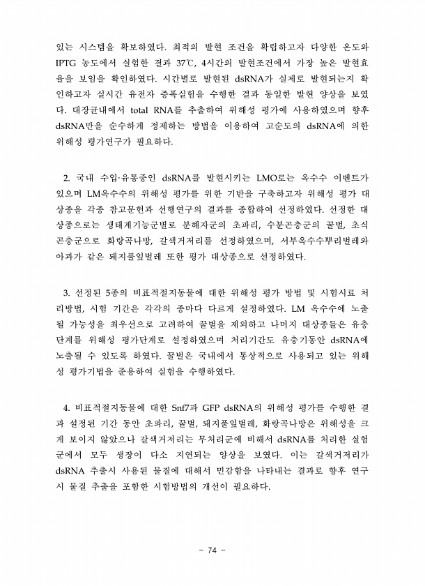있는 시스템을 확보하였다. 최적의 발현 조건을 확립하고자 다양한 온도와 IPTG 농도에서 실험한 결과 37℃, 4시간의 발현조건에서 가장 높은 발현효 율을 보임을 확인하였다. 시간별로 발현된 dsRNA가 실제로 발현되는지 확 인하고자 실시간 유전자 증폭실험을 수행한 결과 동일한 발현 양상을 보였 다. 대장균내에서 total RNA를 추출하여 위해성 평가에 사용하였으며 향후 dsRNA만을 순수하게 정제하는 방법을 이용하여 고순도의 dsRNA에 의한 위해성 평가연구가 필요하다. 2. 국내 수입·유통중인 dsRNA를 발현시키는 LMO로는 옥수수 이벤트가 있으며 LM옥수수의 위해성 평가를 위한 기반을 구축하고자 위해성 평가 대 상종을 각종 참고문헌과 선행연구의 결과를 종합하여 선정하였다. 선정한 대 상종으로는 생태...