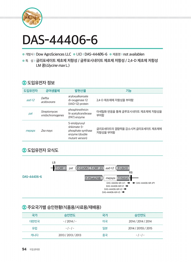 94 국립생태원 ● 개발사ⅠDow AgroSciences LLC ● UIDⅠDAS-444Ø6-6 ● 제품명Ⅰnot availablen ● 특 성Ⅰ글리포세이트 제초제 저항성 글루포시네이트 제초제 저항성 2,4-D 제초제 저항성 LM 콩 Glycine max L. DAS-44406-6 주요국가별 승인현황 식품용/사료용/재배용 국가 승인연도 국가 승인연도 대한민국 2014 미국 2014 2014 2014 유럽 일본 2014 20155 2015 캐나다 2013 2013 2013 중국 도입유전자 정보 도입유전자 공여생물체 발현산물 기능 aad-12 Delftia acidovorans aryloxyalkanoate di-oxygenase 12 AAD-12 protein 2,4-D 제초제에 저항성을 부여함 pat Str...
