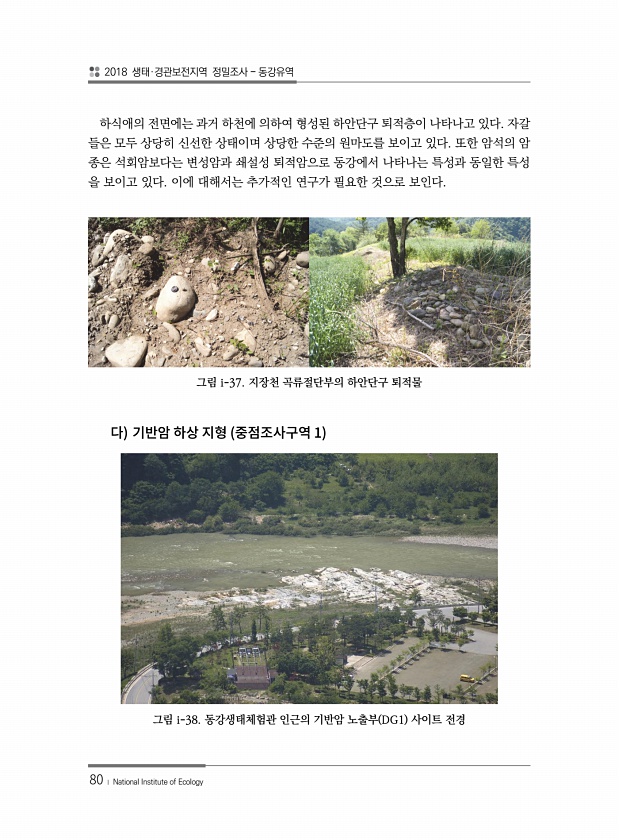 2018 생태·경관보전지역 정밀조사 동강유역 80 ? National Institute of Ecology 하식애의 전면에는 과거 하천에 의하여 형성된 하안단구 퇴적층이 나타나고 있다. 자갈 들은 모두 상당히 신선한 상태이며 상당한 수준의 원마도를 보이고 있다. 또한 암석의 암 종은 석회암보다는 변성암과 쇄설성 퇴적암으로 동강에서 나타나는 특성과 동일한 특성 을 보이고 있다. 이에 대해서는 추가적인 연구가 필요한 것으로 보인다. 그림 i-37. 지장천 곡류절단부의 하안단구 퇴적물 1 그림 i-38. 동강생태체험관 인근의 기반암 노출부 DG1 사이트전경