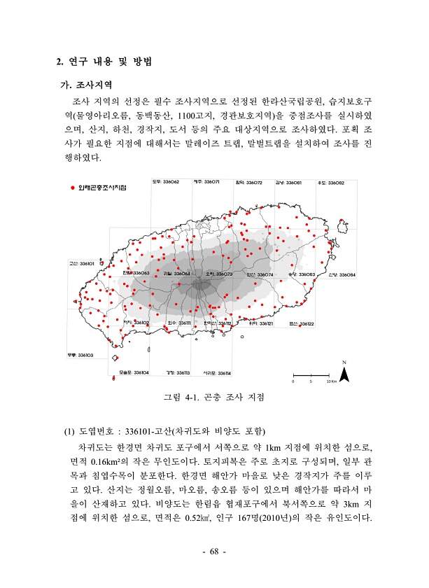 68 2. 연구 내용 및 방법 가. 조사지역 조사 지역의 선정은 필수 조사지역으로 선정된 한라산국립공원, 습지보호구 역 물영아리오름, 동백동산, 1100고지, 경관보호지역 을 중점조사를 실시하였 으며, 산지, 하천, 경작지, 도서 등의 주요 대상지역으로 조사하였다. 포획 조 사가 필요한 지점에 대해서는 말레이즈 트랩, 말벌트랩을 설치하여 조사를 진 행하였다. 그림 4-1. 곤충 조사 지점 1 도엽번호 336101-고산 차귀도와 비양도 포함 차귀도는 한경면 차귀도 포구에서 서쪽으로 약 1km 지점에 위치한 섬으로, 면적 0.16km²의 작은 무인도이다. 토지피복은 주로 초지로 구성되며, 일부 관 목과 침엽수목이 분포한다. 한경면 해안가 마을로 낮은 경작지가 주를 이루 고 있다. 산지는 정월오름, 마오름, 송오...