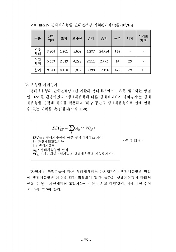 구분 산림 지역 초지 과수원 경지 습지 수역 나지 시가화 지역 기후 재해 3,904 1,301 2,603 1,287 24,724 665 사면 재해 5,639 2,819 4,229 2,111 2,472 14 29 합계 9,543 4,120 6,832 3,398 27,196 679 29 0 표 생태계유형별 단위면적당 가치평가계수 원 유형별 가치평가 생태계유형의 단위면적당 년 기준의 생태계서비스 가치를 평가하는 방법 인 를 활용하였다 생태계유형에 따른 생태계서비스 가치평가 는 생태 계유형별 면적에 계수를 적용하여 해당 공간의 생태계유형으로 인해 얻을 수 있는 가치를 측정 한다 수식 ? ? × ?? 생태계유형에 따른 생태계서비스 가치 자연재해조절기능 생태계유형 생태계유형별 면적 자연재해조...