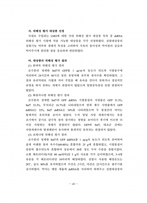 viii 사. 위해성 평가 대상종 선정 국내로 수입되는 LMO에 대한 국내 위해성 평가 대상종 목록 중 dsRNA 위해성 평가 시험에 적용 가능한 대상종을 각각 선정하였다. 실험대상종의 실험기능 여부와 생태적 특성을 고려하여 사육의 용이성과 먹이원의 공급과 먹이주기에 편리한 점을 중요하게 판단하였다. 아. 대상종의 위해성 평가 결과 1 물벼룩 위해성 평가 결과 순수분리 정제한 Snf7과 GFP를 1 ㎍/㎖의 농도가 되도록 시험용수에 처리하여 24시간과 48시간 동안 유영저해 유무와 생사수를 확인하였다. 그 결과 유리막대로 가볍게 저어 주었을 때 유속을 견디지 못하거나 정상적인 유영을 하지 못하는 개체가 관찰되지 않았으며 일반중독증상 또한 관찰되지 않았다. 2 화랑곡나방 위해성 평가 결과 순수분리 정제한 Sn...