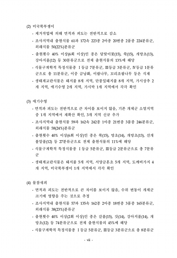 vii 2 미국쑥부쟁이 제거작업에 의해 면적과 피도는 전반적으로 감소 조사지역내 출현식물 61과 172속 223종 2아종 20변종 2품종 224분류군, 외래식물 50 22% 분류군 출현횟수 40% 이상 6회 이상 인 종은 달맞이꽃 15 , 쑥 15 , 개망초 13 , 강아지풀 12 등 30분류군으로 전체 출현식물의 13%에 해당 식물구계학적 특정식물종 Ⅰ등급 7분류군, Ⅲ등급 3분류군, Ⅳ등급 1분류 군으로 총 11분류군, 이중 금낭화, 이팝나무, 꼬리조팝나무 등은 식재 생태계교란식물은 돼지풀 8개 지역, 단풍잎돼지풀 8개 지역, 가시상추 2 개 지역, 애기수영 2개 지역, 가시박 1개 지역에서 각각 확인 3 애기수영 면적과 피도는 전반적으로 큰 차이를 보이지 않음, 기존 개체군 소멸지역 중 1개 지역에서 ...