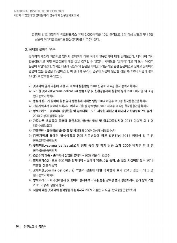 94 탐구보고서 중등부 제5회 국립생태원 생태동아리 탐구대회 탐구결과보고서 5 방제 방법5월부터 에토펜프록스 유제 2,000배액를 10일 간격으로 3회 이상 살포하거나 5월 상순에 이미다클로프리드 분산성액제를 나무주사한다. 2. 국내의 꽃매미 연구 꽃매미의 채집이 지연되고 있어서 꽃매미에 대한 국내의 연구결과에 대해 알아보았다. 네이버에 가서 번문정보라고 치면 학술정보에 대한 것을 검색할 수 있었다. 키워드를 ‘꽃매미’라고 쳐 보니 44건의 논문이 확인되었다. 하지만 이중에 상당수의 논문은 매미꽃이라는 식물 관련 논문이었고 실제로 꽃매미와 관련이 있는 논문은 29편이었다. 이 중에서 우리의 연구에 도움이 될만한 것을 추려보니 다음과 같이 14편으로 압축할 수 있었다. 가. 꽃매미의 알과 약충에 대한 26 약...
