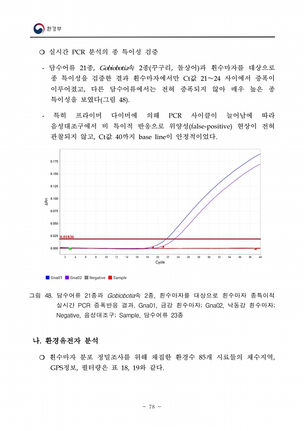 78 ? 실시간 PCR 분석의 종 특이성 검증 담수어류 21종, Gobiobotia속 2종 꾸구리, 돌상어 과 흰수마자를 대상으로 종 특이성을 검증한 결과 흰수마자에서만 Ct값 21∼24 사이에서 증폭이 이루어졌고, 다른 담수어류에서는 전혀 증폭되지 않아 매우 높은 종 특이성을 보였다 그림 48 특히 프라이머 다이머에 의해 PCR 사이클이 늘어남에 따라 음성대조구에서 비 특이적 반응으로 위양성 false-positive 현상이 전혀 관찰되지 않고, Ct값 40까지 base line이 안정적이었다. 그림 48. 담수어류 21종과 Gobiobotia속 2종, 흰수마자를 대상으로 흰수마자 종특이적 실시간 PCR 증폭반응 결과. Gna01, 금강 흰수마자; Gna02, 낙동강 흰수마자; Negative, 음성대조구...