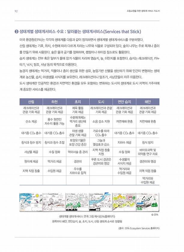 ? 생태계별 생태계서비스 수요 달라붙는 생태계서비스 Services that Stick 미국 환경청 EPA 는 각각의 생태계를 다음과 같이 정의하면서 생태계별 생태계서비스를 구분하였다. 산림 생태계는 기후, 위치, 수원에 따라 다르게 자라는 나무와 식물로 구성되어 있다. 숲의 나무는 주로 목재나 종이 를 만들기 위해 사용된다. 숲은 물과 공기를 정화하며, 캠핑이나 하이킹 장소로도 활용된다. 습지 생태계는 전부 혹은 일부가 물에 잠겨 식물이 자라며 염습지, 늪, 이탄지를 포함한다. 습지는 레크레이션, 카누 타기, 낚시, 탐조, 사냥 등의 목적으로 이용된다. 농경지 생태계는 먹거리, 직물이나 종이 생산을 위한 섬유, 농업기반 산물을 생산하기 위해 인간이 변형하는 생태 계로 농산물, 습지, 야생생물 서식지를 보유...