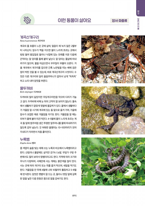091 양구 DDDDDDD 이런 동물이 살아요 양서·파충류 누룩뱀 Elaphe dione 뱀과 몸 색깔이 술을 빚는 데에 쓰는 누룩과 비슷해서 누룩뱀이라고 한다. 산림이나 풀밭에도 살지만 강가나 논밭, 무덤가 구멍 주 변에서도 많이 보여서 땅뱀이라고도 한다. 지역에 따라 크기와 무늬가 다양하며, 서해안에 사는 개체는 붉은색을 많이 띤다. 사는 곳에 따라 개구리 또는 쥐를 즐겨 먹으며, 새알을 먹기도 한다. 겨울잠을 잔 뒤에 4월에 나와 10월까지 활동하고 58월 에 번식한다. 암컷은 햇볕이 잘 드는 곳, 돌이나 볏짚 밑에 길쭉 한 알을 낳은 다음 한동안 몸으로 알을 감싸기도 한다. 물두꺼비 Bufo stejnegeri 두꺼비과 두꺼비와 많이 닮았지만 무당개구리만큼 작으며 다리가 가늘 고 길다. 두꺼비에 비해...