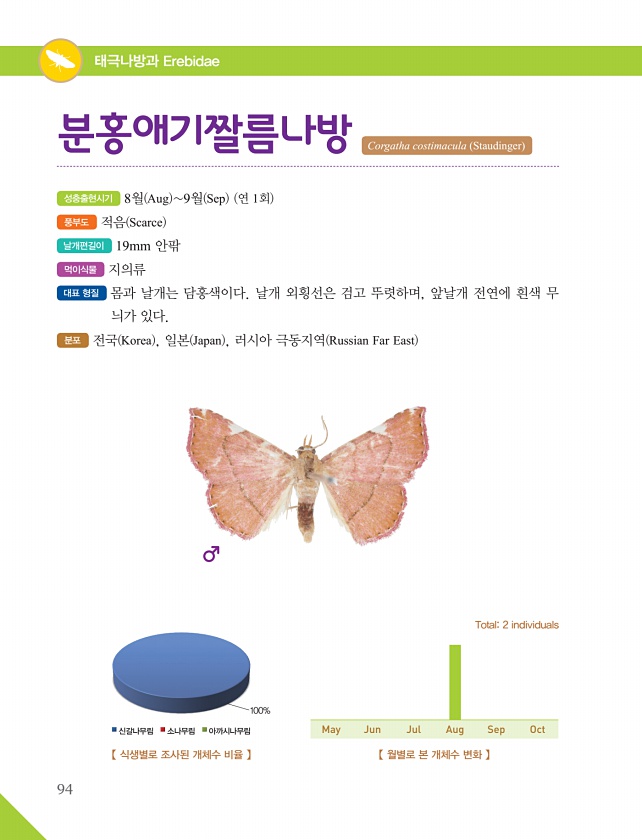 94 태극나방과 Erebidae 성충출현시기 8월 Aug 9월 Sep 연 1회 풍부도 적음 Scarce 날개편길이 19mm 안팎 먹이식물 지의류 대표 형질 몸과 날개는 담홍색이다. 날개 외횡선은 검고 뚜렷하며, 앞날개 전연에 흰색 무 늬가 있다. 분포 전국 Korea , 일본 Japan , 러시아 극동지역 Russian Far East 분홍애기짤름나방 Corgatha costimacula Staudinger 【 월별로 본 개체수 변화 】 Total2 individuals 【 식생별로 조사된 개체수 비율 】 100% 신갈나무림 소나무림 아까시나무림 May Jun Jul Aug SepOct