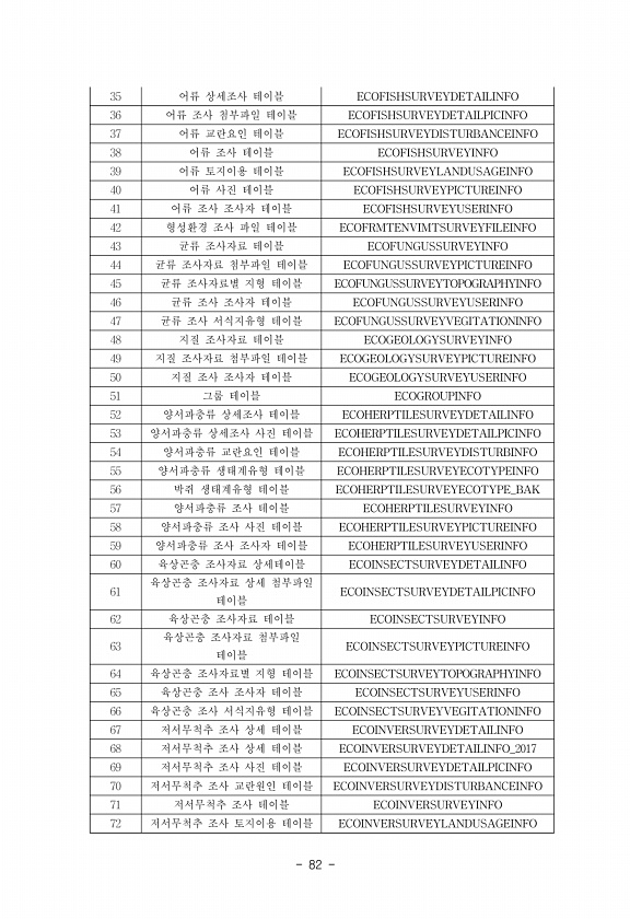 82 35 어류 상세조사 테이블 ECOFISHSURVEYDETAILINFO 36 어류 조사 첨부파일 테이블 ECOFISHSURVEYDETAILPICINFO 37 어류 교란요인 테이블 ECOFISHSURVEYDISTURjANCEINFO 3? 어류 조사 테이블 ECOFISHSURVEYINFO 3B 어류 토지이용 테이블 ECOFISHSURVEYLANDUSAHEINFO 40 어류 사진 테이블? 어류 조사 조사] 테이블? 형성환경 조사 파일 테이블 ECOFRCTENVICTSURVEYFILEINFO 43 균류 조사]^ 테이블 ECOFUNHUSSURVEYINFO 44 균류 조사]^ 첨부파일 테이블 ECOFUNHUSSURVEYPICTUREINFO 45 균류 조사]^?지형 테이블 ECOFUNHUSSURVEYTOPOHRAPH...