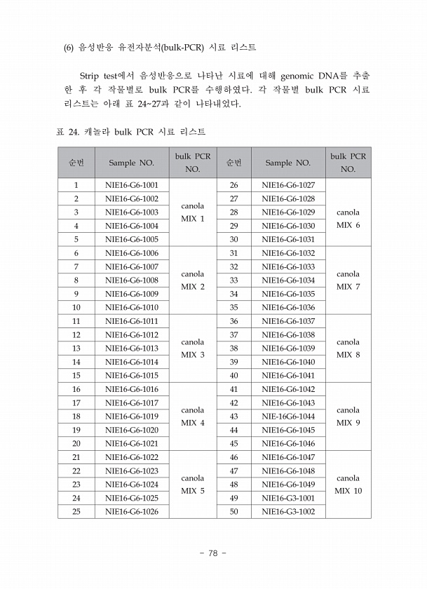 순번 Sample NO. bulk PCR NO. 순번 Sample NO. bulk PCR NO. 1 NIE16-G6-1001 canola MIX 1 26 NIE16-G6-1027 canola MIX 6 2 NIE16-G6-1002 27 NIE16-G6-1028 3 NIE16-G6-1003 28 NIE16-G6-1029 4 NIE16-G6-1004 29 NIE16-G6-1030 5 NIE16-G6-1005 30 NIE16-G6-1031 6 NIE16-G6-1006 canola MIX 2 31 NIE16-G6-1032 canola MIX 7 7 NIE16-G6-1007 32 NIE16-G6-1033 8 NIE16-G6-1008 33 NIE16-G6-1034 9 NIE16-G6-1009 34 NIE16-G6-10...