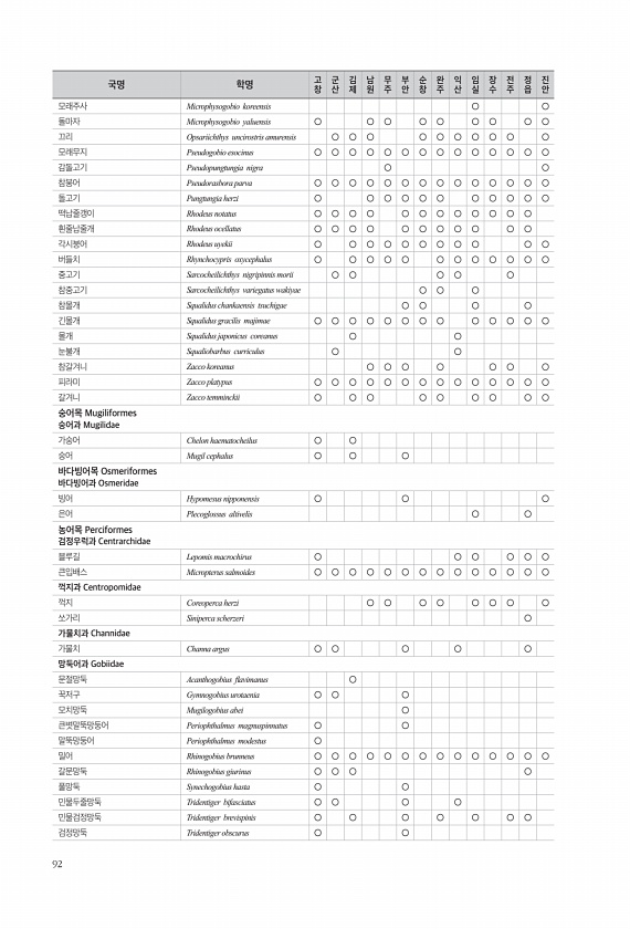 92 모래주사 Microphysogobio koreensis ○ ○ 돌마자 Microphysogobio yaluensis ○ ○ ○ ○ ○ ○ ○ ○ ○ 끄리 Opsariichthys uncirostris amurensis ○ ○ ○ ○ ○ ○ ○ ○ ○ ○ 모래무지 Pseudogobio esocinus ○ ○ ○ ○ ○ ○ ○ ○ ○ ○ ○ ○ ○ ○ 감돌고기 Pseudopungtungia nigra ○ ○ 참붕어 Pseudorasbora parva ○ ○ ○ ○ ○ ○ ○ ○ ○ ○ ○ ○ ○ ○ 돌고기 Pungtungia herzi ○ ○ ○ ○ ○ ○ ○ ○ ○ ○ ○ 떡납줄갱이 Rhodeus notatus ○ ○ ○ ○ ○ ○ ○ ○ ○ ○ ○ ○ 흰줄납줄개 Rhodeus ocellatus ○ ○ ...