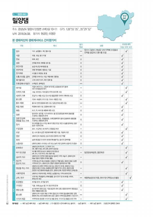 No. 밀양- 본 생태자산의 생태계서비스 간이평가지 구분 예시 평가 등급 설명 규모별 혜택 지점 지역 국가 공급 담수 식수, 농업용수, 축산 용수 등 ++ 양산시·밀양시·창녕군 3개 지역에 수돗물과 전력을 공급하고 홍수를 조절 √ 식량 곡물, 과실, 물고기 등 ++ √ 연료 화목, 토탄 0 √ 섬유 건축용 목재, 의류용 섬유 등 0 √ 유전자원 농업·축산업 희귀품종 등 0 √ 천연약재 전통 의약품에 사용되는 식물 0 √ 장식재료 수집용 조개껍질, 꽃 등 0 √ 진흙,미네랄, 골재 건축용 모래 또는 자갈, 벽돌재료 진흙 등 0 √ 폐기물처리 고체 쓰레기 하치, 폐수 방류 등 0 √ 친환경에너지발전 조력발전, 풍력발전 ++ √ 조절 대기질 자동차 배기가스, 산업체 대기오염, 농업발생 먼지 등의 대기 미세물질의 ...