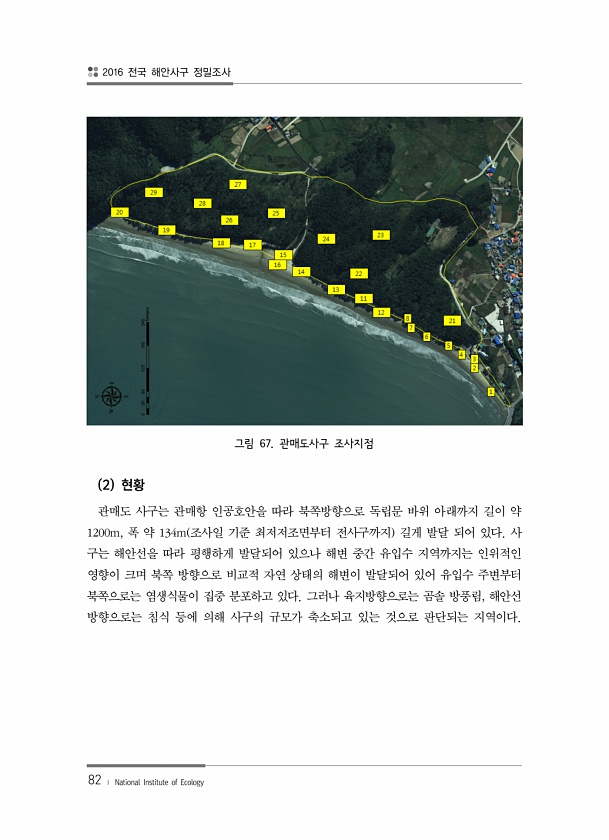 2016 전국 해안사구 정밀조사 82 ? National Institute of Ecology 그림 67. 관매도사구 조사지점 2 현황 관매도 사구는 관매항 인공호안을 따라 북쪽방향으로 독립문 바위 아래까지 길이 약 1200m, 폭 약 134m 조사일 기준 최저저조면부터 전사구까지 길게 발달 되어 있다. 사 구는 해안선을 따라 평행하게 발달되어 있으나 해변 중간 유입수 지역까지는 인위적인 영향이 크며 북쪽 방향으로 비교적 자연 상태의 해변이 발달되어 있어 유입수 주변부터 북쪽으로는 염생식물이 집중 분포하고 있다. 그러나 육지방향으로는 곰솔 방풍림, 해안선 방향으로는 침식 등에 의해 사구의 규모가 축소되고 있는 것으로 판단되는지역이다.