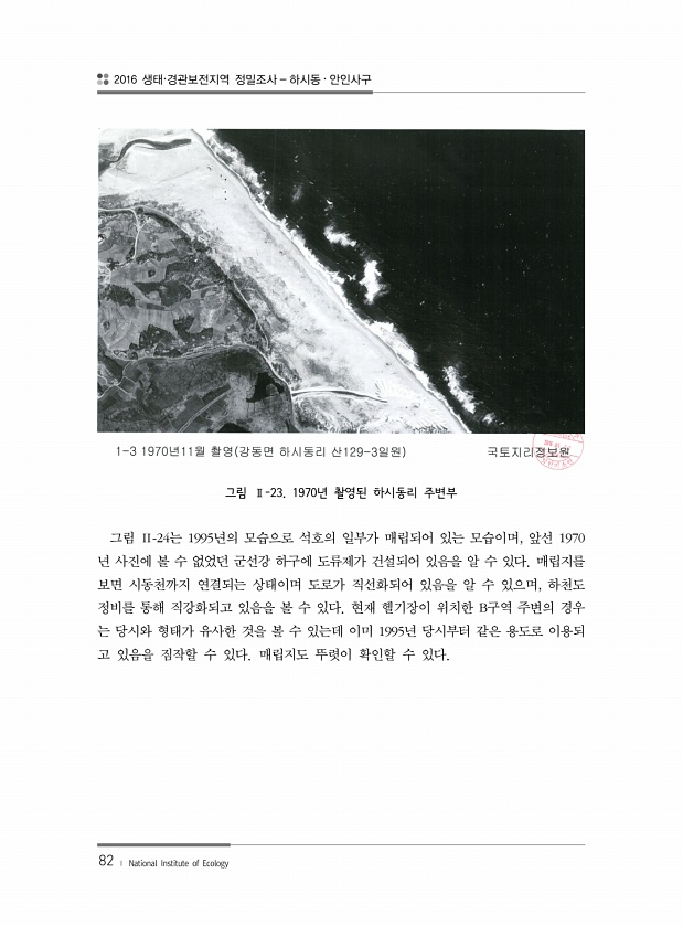 2016 생태·경관보전지역 정밀조사 하시동 · 안인사구 82 ? National Institute of Ecology 그림 Ⅱ-23. 1970년 촬영된 하시동리 주변부 그림 Ⅱ-24는 1995년의 모습으로 석호의 일부가 매립되어 있는 모습이며, 앞선 1970 년 사진에 볼 수 없었던 군선강 하구에 도류제가 건설되어 있음을 알 수 있다. 매립지를 보면 시동천까지 연결되는 상태이며 도로가 직선화되어 있음을 알 수 있으며, 하천도 정비를 통해 직강화되고 있음을 볼 수 있다. 현재 헬기장이 위치한 B구역 주변의 경우 는 당시와 형태가 유사한 것을 볼 수 있는데 이미 1995년 당시부터 같은 용도로 이용되 고 있음을 짐작할 수 있다. 매립지도 뚜렷이 확인할 수있다.