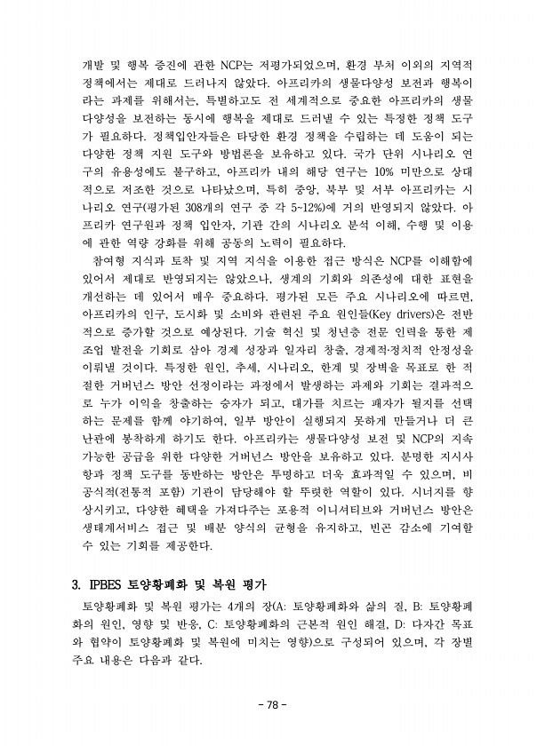 78 개발 및 행복 증진에 관한 NCP는 저평가되었으며, 환경 부처 이외의 지역적 정책에서는 제대로 드러나지 않았다. 아프리카의 생물다양성 보전과 행복이 라는 과제를 위해서는, 특별하고도 전 세계적으로 중요한 아프리카의 생물 다양성을 보전하는 동시에 행복을 제대로 드러낼 수 있는 특정한 정책 도구 가 필요하다. 정책입안자들은 타당한 환경 정책을 수립하는 데 도움이 되는 다양한 정책 지원 도구와 방법론을 보유하고 있다. 국가 단위 시나리오 연 구의 유용성에도 불구하고, 아프리카 내의 해당 연구는 10% 미만으로 상대 적으로 저조한 것으로 나타났으며, 특히 중앙, 북부 및 서부 아프리카는 시 나리오 연구 평가된 308개의 연구 중 각 512% 에 거의 반영되지 않았다. 아 프리카 연구원과 정책 입안자, 기관 간...