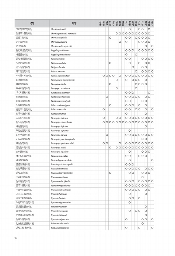 92 오리엔트조명나방 Ostrinia orientalis ○ ○ ○ ○ 분홍무늬들명나방 Ostrinia palustralis memnialis ○ ○ ○ ○ ○ ○ ○ ○ ○ ○ ○ 콩줄기명나방 Ostrinia scapulalis ○ ○ ○ ○ ○ ○ ○ ○ 큰섬들명나방 Ostrinia zaguliaevi ○ ○ ○ ○ ○ ○ 큰조명나방 Ostrinia zealis bipatrialis ○ ○ 몸긴네줄들명나방 Pagyda quadrilineata ○ ○ ○ ○ ○ ○ ○ ○ 네줄들명나방 Pagyda quinquelineata ○ ○ 금빛세줄들명나방 Paliga auratalis ○ ○ ○ ○ ○ ○ 앞붉은들명나방 Paliga minnehaha ○ ○ ○ ○ ○ 큰노랑들명나방 Paliga ochrealis ○...