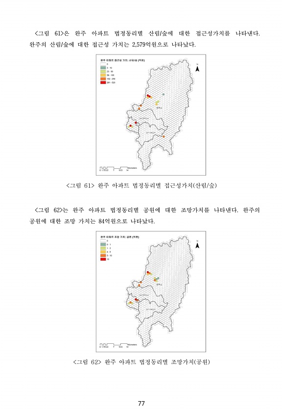 77 그림 61 은 완주 아파트 법정동리별 산림/숲에 대한 접근성가치를 나타낸다. 완주의 산림/숲에 대한 접근성 가치는 2,579억원으로 나타났다. 그림 61 완주 아파트 법정동리별 접근성가치 산림/숲 그림 62 는 완주 아파트 법정동리별 공원에 대한 조망가치를 나타낸다. 완주의 공원에 대한 조망 가치는 84억원으로 나타났다. 그림 62 완주 아파트 법정동리별 조망가치 공원