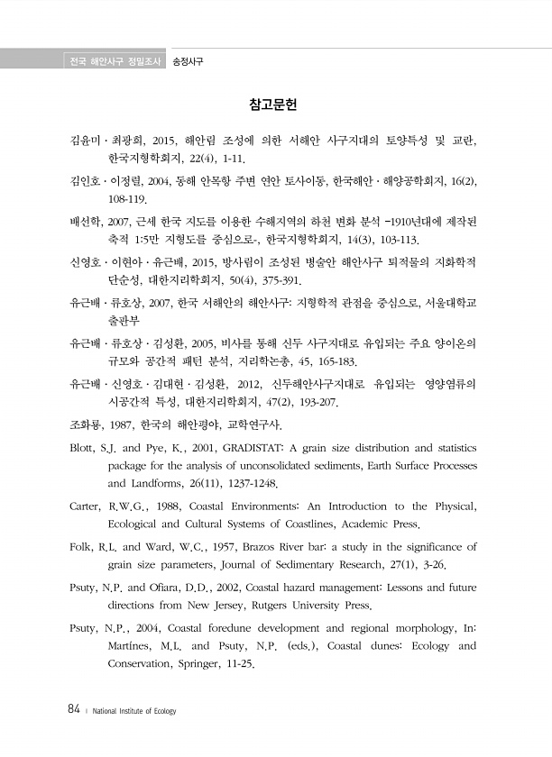 전국 해안사구 정밀조사 송정사구 84 ? National Institute of Ecology 참고문헌 김윤미·최광희, 2015, 해안림 조성에 의한 서해안 사구지대의 토양특성 및 교란, 한국지형학회지, 22 4 , 1-11. 김인호·이정렬, 2004, 동해 안목항 주변 연안 토사이동, 한국해안·해양공학회지, 16 2 , 108-119. 배선학, 2007, 근세 한국 지도를 이용한 수해지역의 하천 변화 분석 ?1910년대에 제작된 축적 15만 지형도를 중심으로-, 한국지형학회지, 14 3 , 103-113. 신영호·이현아·유근배, 2015, 방사림이 조성된 병술안 해안사구 퇴적물의 지화학적 단순성, 대한지리학회지, 50 4 , 375-391. 유근배·류호상, 2007, 한국 서해안의 해안사구지형학적 관점을 ...