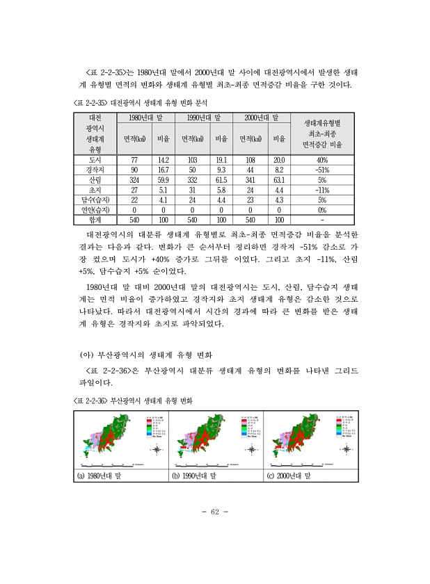 62 표 2-2-35 는 1980년대 말에서 2000년대 말 사이에 대전광역시에서 발생한 생태 계 유형별 면적의 변화와 생태계 유형별 최초-최종 면적증감 비율을 구한 것이다. 대전 광역시 생태계 유형 1980년대 말 1990년대 말 2000년대 말 생태계유형별 최초-최종 면적 ㎢ 비율 면적 ㎢ 비율 면적 ㎢ 비율 면적증감 비율 도시 77 14.2 103 19.1 108 20.0 40% 경작지 90 16.7 50 9.3 44 8.2 -51% 산림 324 59.9 332 61.5 341 63.1 5% 초지 27 5.1 31 5.8 24 4.4 -11% 담수 습지 22 4.1 24 4.4 23 4.3 5% 연안 습지 0 0 0 0 0 0 0% 합계 540 100 540 100 540 100 표 2-2-35 대전광...