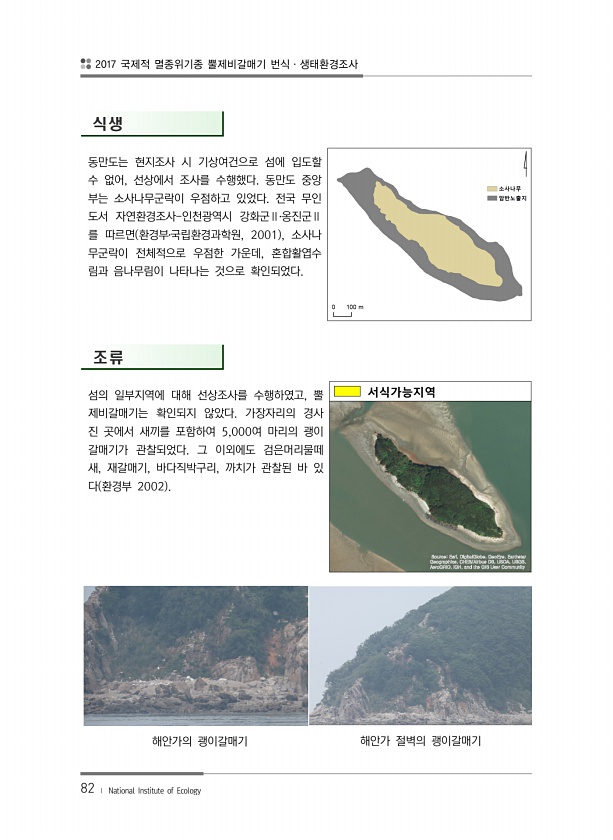 2017 국제적 멸종위기종 뿔제비갈매기 번식·생태환경조사 82 ? National Institute of Ecology 식생 동만도는 현지조사 시 기상여건으로 섬에 입도할 수 없어, 선상에서 조사를 수행했다. 동만도 중앙 부는 소사나무군락이 우점하고 있었다. 전국 무인 도서 자연환경조사-인천광역시 강화군Ⅱ?옹진군Ⅱ 를 따르면 환경부?국립환경과학원, 2001 , 소사나 무군락이 전체적으로 우점한 가운데, 혼합활엽수 림과 음나무림이 나타나는 것으로 확인되었다. 조류 섬의 일부지역에 대해 선상조사를 수행하였고, 뿔 제비갈매기는 확인되지 않았다. 가장자리의 경사 진 곳에서 새끼를 포함하여 5,000여 마리의 괭이 갈매기가 관찰되었다. 그 이외에도 검은머리물떼 새, 재갈매기, 바다직박구리, 까치가 관찰된 바 있 다 ...