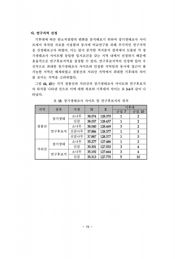 78 다 연구지역 선정 기후대에 따른 탄소저장량의 변화를 분석해보기 위하여 장기생태조사 사이 트에서 축적된 자료를 이용함과 동시에 비교연구를 위해 추가적인 연구지역 을 선정해보고자 하였다 이는 앞서 분석한 적지분석 결과에서 도출된 각 장 기생태조사 사이트별 동일한 입지조건을 갖는 지역 내에서 선정하기 때문에 효율적으로 연구후보지역을 결정할 수 있다 연구후보지역의 선정에 있어 우 선적으로 최대한 장기생태조사 사이트와 인접한 지역임과 동시에 접근이 불 가능한 지역은 배제하였고 점봉산과 지리산 지역에서 최대한 기후대의 차이 를 보이는 지역을 고려하였다 그림 는 각각 점봉산과 지리산의 장기생태조사 사이트와 연구후보지 의 위치를 나타낸 것으로 이에 대한 좌표와 기후대의 차이는 표 과 같이 나 타났다 지역 종류 식생 ...
