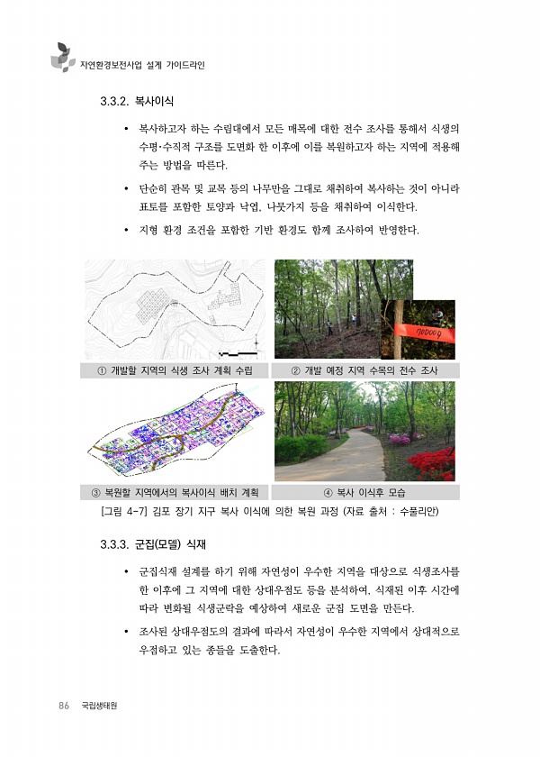 86 국립생태원 자연환경보전사업 설계 가이드라인 3.3.2. 복사이식 복사하고자 하는 수림대에서 모든 매목에 대한 전수 조사를 통해서 식생의 수평?수직적 구조를 도면화 한 이후에 이를 복원하고자 하는 지역에 적용해 주는 방법을 따른다. 단순히 관목 및 교목 등의 나무만을 그대로 채취하여 복사하는 것이 아니라 표토를 포함한 토양과 낙엽, 나뭇가지 등을 채취하여 이식한다. 지형 환경 조건을 포함한 기반 환경도 함께 조사하여 반영한다. ① 개발할 지역의 식생 조사 계획 수립 ② 개발 예정 지역 수목의 전수 조사 ③ 복원할 지역에서의 복사이식 배치 계획 ④ 복사 이식후 모습 [그림 4-7] 김포 장기 지구 복사 이식에 의한 복원 과정 자료 출처 수풀리안 3.3.3. 군집 모델 식재 군집식재 설계를 하기 위해 자연성...