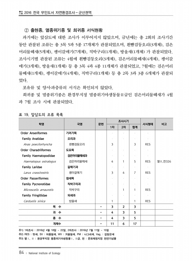 2016 전국 무인도서 자연환경조사 군산권역 84 ? National Institute of Ecology ② 출현종, 멸종위기종 및 희귀종 서식현황 과거에는 앞삼도에 대한 조사가 이루어지지 않았으며, 금년에는 총 2회의 조사기간 동안 관찰된 조류는 총 3목 5과 5종 17개체가 관찰되었으며, 흰뺨검둥오리 3개체 , 검은 머리물떼새 5개체 , 괭이갈매기 7개체 , 직박구리 1개체 , 방울새 1개체 가 관찰되었다. 조사시기별 관찰된 조류는 4월에 흰뺨검둥오리 3개체 , 검은머리물떼새 4개체 , 괭이갈 매기 3개체 , 방울새 1개체 등 총 3목 4과 4종 11개체가 관찰되었고, 7월에는 검은머리 물떼새 1개체 , 괭이갈매기 4개체 , 직박구리 1개체 등 총 2목 3과 3종 6개체가 관찰되 었다. 포유류 및 양서...