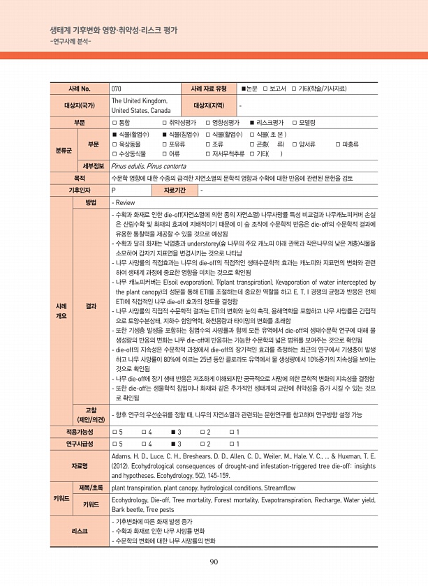 90 생태계 기후변화 영향·취약성·리스크 평가 -연구사례 분석- 사례 No. 070 사례 자료 유형 ■논문 □ 보고서 □ 기타 학술/기사자료 대상지 국가 The United Kingdom, United States, Canada 대상지 지역 부문 □ 통합 □ 취약성평가 □ 영향성평가 ■ 리스크평가 □ 모델링 분류군 부문 ■ 식물 활엽수 ■ 식물 침엽수 □ 식물 활엽수 □ 식물 초 본 □ 육상동물 □ 포유류 □ 조류 □ 곤충 류 □ 양서류 □ 파충류 □ 수상동식물 □ 어류 □ 저서무척추류 □ 기타 세부정보 Pinus edulis, Pinus contorta 목적 수문학 영향에 대한 수종의 급격한 자연소멸의 문학적 영향과 수확에 대한 반응에 관련된 문헌을 검토 기후인자 P 자료기간 사례 개요 방법 Review ...