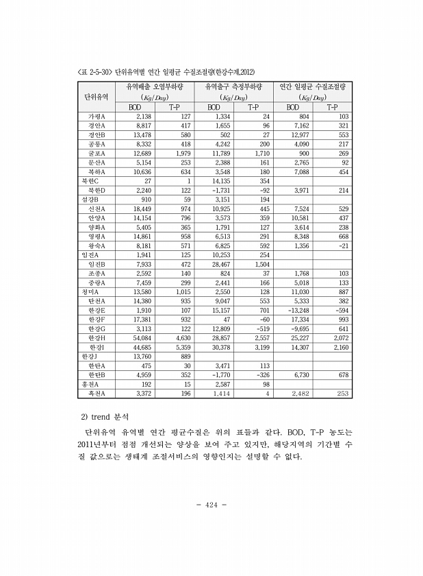 424 단위유역 유역배출 오염부하량 ??? 유역출구 측정부하량 ??? 연간 일평균 수질조절량 ??? BOD T-P BOD T-P BOD T-P 가평A 2,138 127 1,334 24 804 103 경안A 8,817 417 1,655 96 7,162 321 경안B 13,478 580 502 27 12,977 553 공릉A 8,332 418 4,242 200 4,090 217 굴포A 12,689 1,979 11,789 1,710 900 269 문산A 5,154 253 2,388 161 2,765 92 복하A 10,636 634 3,548 180 7,088 454 북한C 27 1 14,135 354 북한D 2,240 122 -1,731 -92 3,971 214 섬강B 910 59 3,15...