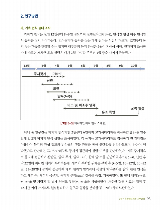 2장 육상생태계와 기후변화 93 2. 연구방법 가. 기초 번식 생태 조사 까치의 번식은 전해 12월부터 8-9월 정도까지 진행된다 그림 5-3 번식쌍 형성 이후 번식쌍 이 둥지를 짓기 시작하는데, 번식쌍마다 둥지를 짓는 데에 걸리는 시간이 다르다. 12월부터 둥 지 짓는 행동을 관찰할 수는 있지만 대부분의 둥지 완성은 2월이 되어야 하며, 현재까지 조사한 바에 따르면 개체군 최초 산란은 대개 2월 마지막 주부터 3월 중순 사이에 관찰된다. [그림 5-3] 대략적인 까치 번식 스케줄. 이에 본 연구진은 까치의 번식기인 2월부터 6월까지 고가사다리차를 이용해 그림 5-4 일주 일에 1, 2회 까치의 번식 상황을 조사하였다. 각 둥지는 고가사다리차로 접근하기 전 쌍안경을 이용하여 둥지의 완성 정도와 번식쌍의 행동...