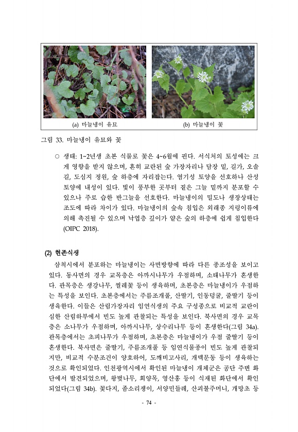 74 a 마늘냉이 유묘 b 마늘냉이 꽃 그림 33. 마늘냉이 유묘와 꽃 ○ 생태12년생 초본 식물로 꽃은 46월에 핀다. 서식처의 토성에는 크 게 영향을 받지 않으며, 흔히 교란된 숲 가장자리나 담장 밑, 길가, 오솔 길, 도심지 정원, 숲 하층에 자리잡는다. 염기성 토양을 선호하나 산성 토양에 내성이 있다. 빛이 풍부한 곳부터 짙은 그늘 밑까지 분포할 수 있으나 주로 습한 반그늘을 선호한다. 마늘냉이의 밀도나 생장상태는 조도에 따라 차이가 있다. 마늘냉이의 숲속 침입은 외래종 지렁이류에 의해 촉진될 수 있으며 낙엽층 깊이가 얕은 숲의 하층에 쉽게 침입한다 OIPC 2018 2 현존식생 삼척시에서 분포하는 마늘냉이는 사면방향에 따라 다른 종조성을 보이고 있다. 동사면의 경우 교목층은 아까시나무가 우점하며, ...