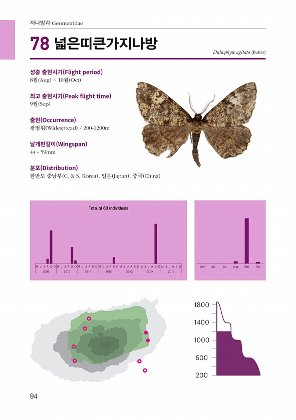 94 자나방과 Geometridae 성충 출현시기 Flight period 8월 Aug 10월 Oct 최고 출현시기 Peak fight time 9월 Sep 출현 Occurrence 광범위 Widespread 200-1200m 날개편길이 Wingspan 44 59mm 분포 Distribution 한반도 중남부 C. & S. Korea , 일본 Japan , 중국 China Duliophyle agitata Butler M J J A S O M J J A S O M J J A S O M J J A S O M J J A S O M J J A S O M J J A S O May Jun Jul Aug Sep Oct 2009 2010 2011 2012 2013 2014 2015 Total of 63 individua...