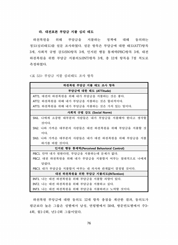 76 라. 대전표본 부담금 지불 심리 태도 하천복원을 위해 부담금을 지불하는 정책에 대해 동의하는 정도 심리태도 를 설문 조사하였다. 설문 항목은 부담금에 대한 태도 ATT 항목 3개, 사회적 규범 강도 SN 항목 3개, 인지된 행동 통제력 PBC 항목 3개, 대전 하천복원을 위한 부담금 지불의도 INT 항목 3개, 총 12개 항목을 7점 척도로 측정하였다. 표 53 부담금 지불 심리태도 조사 항목 하천복원 부담금 지불 태도 조사 항목 부담금에 대한 태도 ATTitude ATT1. 대전의 하천복원을 위해 내가 부담금을 지불하는 것은 좋다. ATT2. 하천복원을 위해 내가 부담금을 지불하는 것은 합리적이다. ATT3. 하천복원을 위해 내가 부담금을 지불하는 것은 가치 있는 일이다. 사회적 규범 강도 Socia...