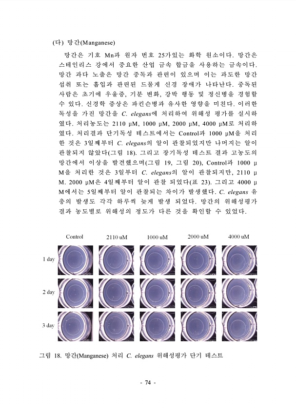 74 다 망간 Manganese 망간은 기호 Mn과 원자 번호 25가있는 화학 원소이다. 망간은 스테인리스 강에서 중요한 산업 금속 합금을 사용하는 금속이다. 망간 과다 노출은 망간 중독과 관련이 있으며 이는 과도한 망간 섭취 또는 흡입과 관련된 드물게 신경 장애가 나타난다. 중독된 사람은 초기에 우울증, 기분 변화, 강박 행동 및 정신병을 경험할 수 있다. 신경학 증상은 파킨슨병과 유사한 영향을 미친다. 이러한 독성을 가진 망간을 C. elegans에 처리하여 위해성 평가를 실시하 였다. 처리농도는 2110 μM, 1000 μM, 2000 μM, 4000 μM로 처리하 였다. 처리결과 단기독성 테스트에서는 Control과 1000 μM을 처리 한 것은 3일쨰부터 C. elegans의 알이 관찰되었지만 나머...
