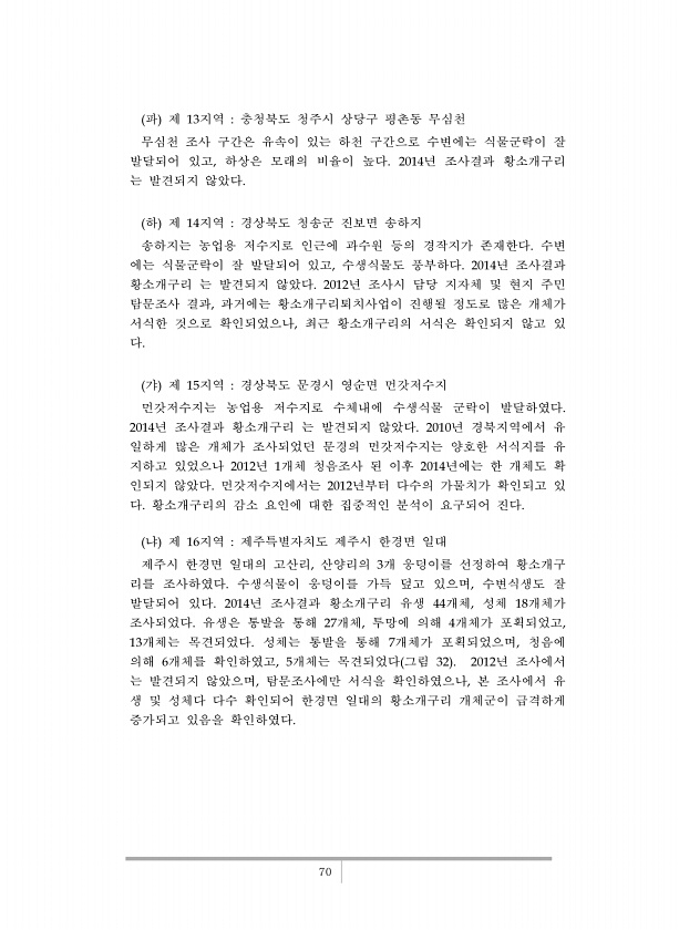 70 파 제 13지역 충청북도 청주시 상당구 평촌동 무심천 무심천 조사 구간은 유속이 있는 하천 구간으로 수변에는 식물군락이 잘 발달되어 있고, 하상은 모래의 비율이 높다. 2014년 조사결과 황소개구리 는 발견되지 않았다. 하 제 14지역 경상북도 청송군 진보면 송하지 송하지는 농업용 저수지로 인근에 과수원 등의 경작지가 존재한다. 수변 에는 식물군락이 잘 발달되어 있고, 수생식물도 풍부하다. 2014년 조사결과 황소개구리 는 발견되지 않았다. 2012년 조사시 담당 지자체 및 현지 주민 탐문조사 결과, 과거에는 황소개구리퇴치사업이 진행될 정도로 많은 개체가 서식한 것으로 확인되었으나, 최근 황소개구리의 서식은 확인되지 않고 있 다. 갸 제 15지역 경상북도 문경시 영순면 먼갓저수지 먼갓저수지는 농업용 저...