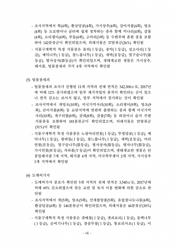 vii 조사지역에서 쑥 4회 , 환삼덩굴 4회 , 가시상추 4회 , 강아지풀 4회 , 망초 4회 등 도로변이나 공터에 쉽게 정착하는 종과 함께 미나리 4회 , 갈풀 4회 , 소리쟁이 4회 , 부들 4회 , 고마리 3회 등 수변부에 흔한 종을 포함 하여 142분류군이 확인되었으며, 외래식물은 37분류군 26% 확인됨 식물구계학적 특정 식물종은 돌외 Ⅰ등급 , 송악 Ⅰ등급 , 실고사리 Ⅰ등 급 , 예덕나무 Ⅰ등급 , 참느릅나무 Ⅰ등급 , 새박 Ⅱ등급 , 멀구슬나무 Ⅲ 등급 , 벌사상자 Ⅲ등급 가 확인되었으며, 생태계교란 생물은 가시상추, 돼지풀, 털물참새피 각각 4개 지역에서 확인됨 5 털물참새피 털물참새피 조사가 진행된 11개 지역의 전체 면적은 342,300㎡로, 2017년 에 비해 12% 증가하였으며 일부...
