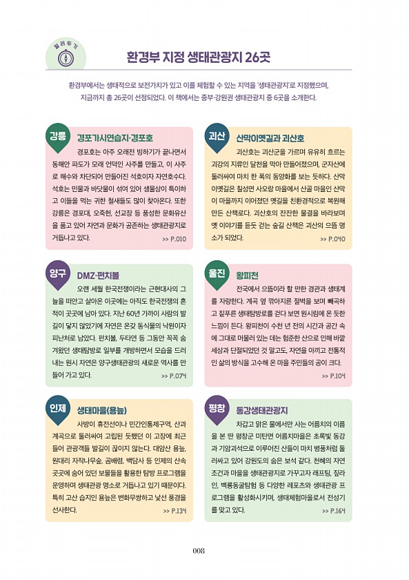 008 환경부 지정 생태관광지 26곳 일 러 두 기 경포가시연습지·경포호 경포호는 아주 오래전 빙하기가 끝나면서 동해안 파도가 모래 언덕인 사주를 만들고, 이 사주 로 해수와 차단되어 만들어진 석호이자 자연호수다. 석호는 민물과 바닷물이 섞여 있어 생물상이 특이하 고 이들을 먹는 귀한 철새들도 많이 찾아온다. 또한 강릉은 경포대, 오죽헌, 선교장 등 풍성한 문화유산 을 품고 있어 자연과 문화가 공존하는 생태관광지로 거듭나고 있다. P.010 DMZ·펀치볼 오랜 세월 한국전쟁이라는 근현대사의 그 늘을 떠안고 살아온 이곳에는 아직도 한국전쟁의 흔 적이 곳곳에 남아 있다. 지난 60년 가까이 사람의 발 길이 닿지 않았기에 자연은 온갖 동식물의 낙원이자 피난처로 남았다. 펀치볼, 두타연 등 그동안 꼭꼭 숨 겨왔던 ...