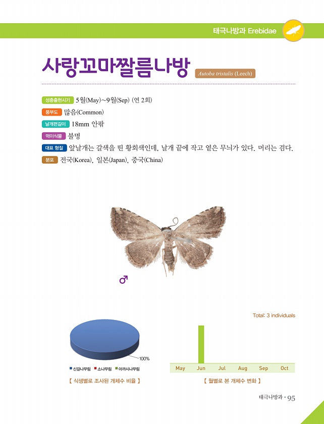 태극나방과?95 태극나방과 Erebidae 성충출현시기 5월 May 9월 Sep 연 2회 풍부도 많음 Common 날개편길이 18mm 안팎 먹이식물 불명 대표 형질 앞날개는 갈색을 띤 황회색인데, 날개 끝에 작고 옅은 무늬가 있다. 머리는 검다. 분포 전국 Korea , 일본 Japan , 중국 China 사랑꼬마짤름나방 Autoba tristalis Leech 【 월별로 본 개체수 변화 】 Total3 individuals 【 식생별로 조사된 개체수 비율 】 100% 신갈나무림 소나무림 아까시나무림 May Jun Jul Aug SepOct
