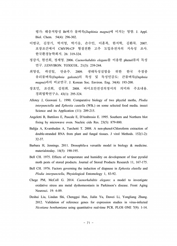 71 평가해충저항성 Bt벼가 물벼룩 Daphinia magna 에 미치는 영향. J. Appl. Biol. Chem. 54 4 296-302. 이범규, 김창기, 박지영, 박기웅, 손수인, 이훈복, 한지학, 김환묵. 2007. 포장조건에서 CMVP0-CP 형질전환 고추 도입유전자의 지속성 조사. 한국환경농학회지. 26319-324. 정강식, 현선희, 정세영. 2006. Caenorhabditis elegans를 이용한 phenol류의 독성 연구. J.ENVIRON. TOXICOL. 21 3 239-244. 최영설, 곽진일, 안윤주. 2009. 생태독성실험을 위한 한국 우점종 유리물벼룩 Daphnia galeata 의 특성 및 독성민감도큰물벼룩 Daphnia magna 과의 비교연구. J. Korean Soc....