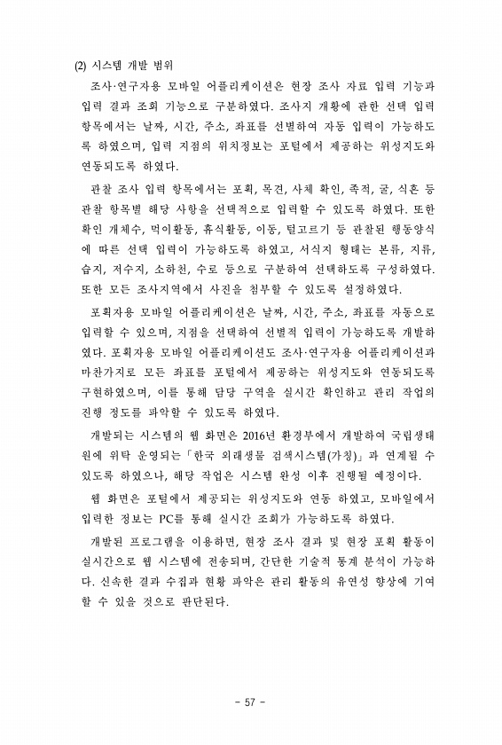 2 시스템 개발 범위 조사·연구자용 모바일 어플리케이션은 현장 조사 자료 입력 기능과 입력 결과 조회 기능으로 구분하였다. 조사지 개황에 관한 선택 입력 항목에서는 날짜, 시간, 주소, 좌표를 선별하여 자동 입력이 가능하도 록 하였으며, 입력 지점의 위치정보는 포털에서 제공하는 위성지도와 연동되도록 하였다. 관찰 조사 입력 항목에서는 포획, 목견, 사체 확인, 족적, 굴, 식흔 등 관찰 항목별 해당 사항을 선택적으로 입력할 수 있도록 하였다. 또한 확인 개체수, 먹이활동, 휴식활동, 이동, 털고르기 등 관찰된 행동양식 에 따른 선택 입력이 가능하도록 하였고, 서식지 형태는 본류, 지류, 습지, 저수지, 소하천, 수로 등으로 구분하여 선택하도록 구성하였다. 또한 모든 조사지역에서 사진을 첨부할 수 있도록 설정...