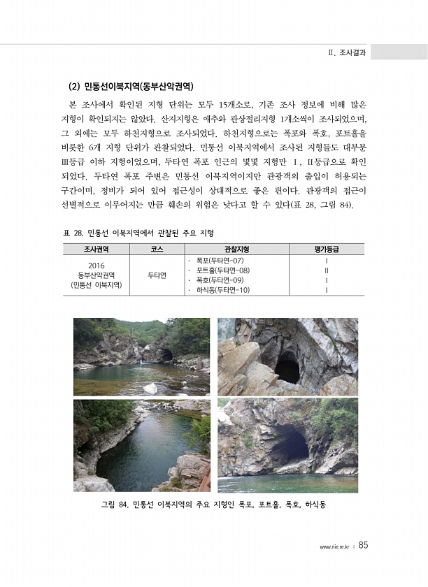 Ⅱ. 조사결과 www.nie.re.kr ? 85 2 민통선이북지역 동부산악권역 본 조사에서 확인된 지형 단위는 모두 15개소로, 기존 조사 정보에 비해 많은 지형이 확인되지는 않았다. 산지지형은 애추와 판상절리지형 1개소씩이 조사되었으며, 그 외에는 모두 하천지형으로 조사되었다. 하천지형으로는 폭포와 폭호, 포트홀을 비롯한 6개 지형 단위가 관찰되었다. 민통선 이북지역에서 조사된 지형들도 대부분 Ⅲ등급 이하 지형이었으며, 두타연 폭포 인근의 몇몇 지형만 Ⅰ, Ⅱ등급으로 확인 되었다. 두타연 폭포 주변은 민통선 이북지역이지만 관광객의 출입이 허용되는 구간이며, 정비가 되어 있어 접근성이 상대적으로 좋은 편이다. 관광객의 접근이 선별적으로 이루어지는 만큼 훼손의 위험은 낮다고 할 수 있다 표 28, 그림 84 ...