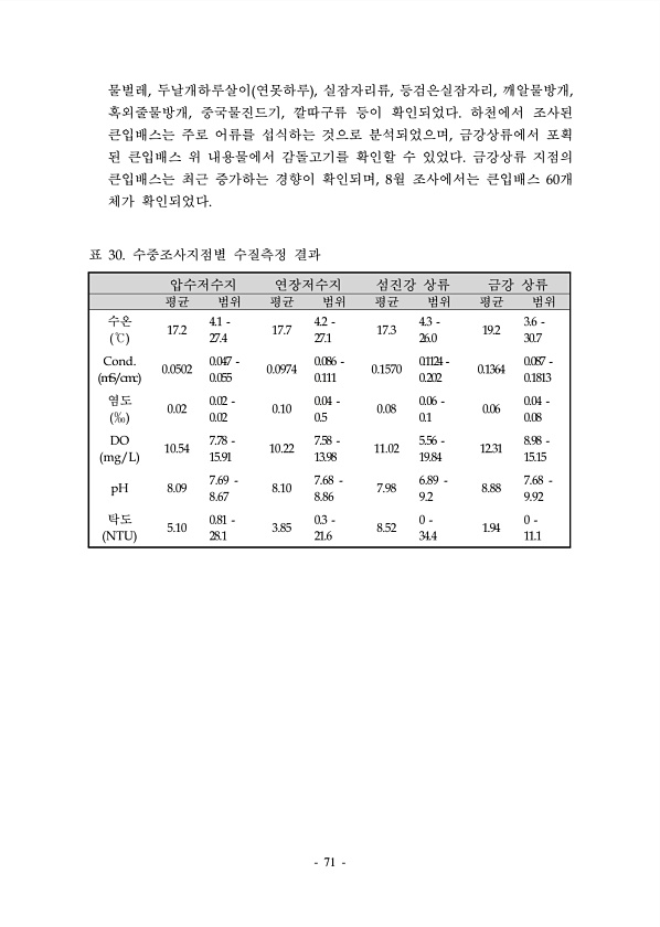 71 물벌레, 두날개하루살이 연못하루 , 실잠자리류, 등검은실잠자리, 깨알물방개, 혹외줄물방개, 중국물진드기, 깔따구류 등이 확인되었다. 하천에서 조사된 큰입배스는 주로 어류를 섭식하는 것으로 분석되었으며, 금강상류에서 포획 된 큰입배스 위 내용물에서 감돌고기를 확인할 수 있었다. 금강상류 지점의 큰입배스는 최근 증가하는 경향이 확인되며, 8월 조사에서는 큰입배스 60개 체가 확인되었다. 압수저수지 연장저수지 섬진강 상류 금강 상류 평균 범위 평균 범위 평균 범위 평균 범위 수온 ℃ 17.2 4.1 27.4 17.7 4.2 27.1 17.3 4.3 26.0 19.2 3.6 30.7 Cond. mS/cmc 0.0502 0.047 0.055 0.0974 0.086 0.111 0.1570 0.1124 0.202 ...