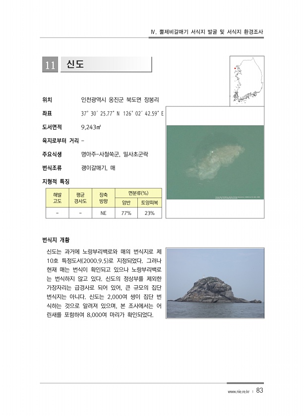 Ⅳ. 뿔제비갈매기 서식지 발굴 및 서식지 환경조사 www.nie.re.kr ? 83 11 신도 위치 인천광역시 옹진군 북도면 장봉리 좌표 37°30′25.77″N 126°02′42.59″E 도서면적 9,243㎡ 육지로부터 거리 주요식생 명아주-사철쑥군, 밀사초군락 번식조류 괭이갈매기, 매 지형적 특징 해발 고도 평균 경사도 장축 방향 면분류 % 암반 토양피복 NE 77% 23% 번식지 개황 신도는 과거에 노랑부리백로와 매의 번식지로 제 10호 특정도서 2000.9.5 로 지정되었다. 그러나 현재 매는 번식이 확인되고 있으나 노랑부리백로 는 번식하지 않고 있다. 신도의 정상부를 제외한 가장자리는 급경사로 되어 있어, 큰 규모의 집단 번식지는 아니다. 신도는 2,000여 쌍이 집단 번 식하는 것으로 알려져 있으...