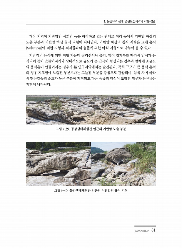 i. 동강유역 생태·경관보전지역의 지형·경관 www.nie.re.kr ? 81 대상 지역이 기반암인 석회암 등을 하각하고 있는 관계로 여러 곳에서 기반암 하상의 노출 부분과 기반암 하상 침식 지형이 나타난다. 기반암 하상의 침식 지형은 크게 용식 Solution 에 의한 지형과 퇴적물과의 충돌에 의한 마식 지형으로 나누어 볼 수 있다. 기반암의 용식에 의한 지형 가운데 절리선이나 층리, 암석 경계부를 따라서 암체가 용 식되어 틈이 만들어지거나 상대적으로 규모가 큰 간극이 형성되는 경우와 암체에 소규모 의 용식흔이 만들어지는 경우가 본 연구지역에서는 발견된다. 특히 규모가 큰 용식 흔적 의 경우 지표면에 노출된 부분보다는 그늘진 부분을 중심으로 관찰되며, 암석 차에 따라 서 탄산칼슘의 순도가 높은 부분이 제거...