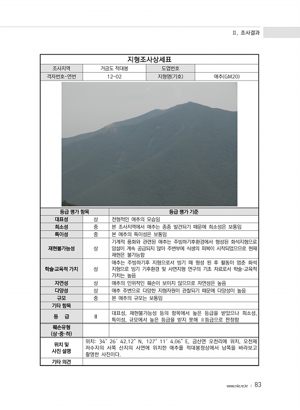 Ⅱ. 조사결과 www.nie.re.kr ? 83 지형조사상세표 조사지역 거금도 적대봉 도엽번호 격자번호-연번 12-02 지형명 기호 애추 GM20 등급 평가 항목 등급 평가 기준 대표성 상 전형적인 애추의 모습임 희소성 중 본 조사지역에서 애추는 종종 발견되기 때문에 희소성은 보통임 특이성 중 본 애추의 특이성은 보통임 재현불가능성 상 기계적 풍화와 관련된 애추는 주빙하기후환경에서 형성된 화석지형으로 암설이 계속 공급되지 않아 주변부에 식생의 피복이 시작되었으므로 현재 재현은 불가능함 학술?교육적 가치 상 애추는 주빙하기후 지형으로서 빙기 때 형성 된 후 활동이 멈춘 화석 지형으로 빙기 기후환경 및 사면지형 연구의 기초 자료로서 학술·교육적 가치는 높음 자연성 상 애추의 인위적인 훼손이 보이지 않으므로 자연...