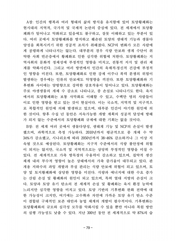 79 A장인간의 행복과 여러 형태의 삶의 방식을 유지함에 있어 토양황폐화는 현시대의 지역적, 국가적 및 국제적 논란의 중심에 있다. 전 세계에서 토양황 폐화가 일어나고 악화되고 있음에도 불구하고, 잘못 이해하고 있는 부분이 있 다. 여러 곳에서 토양황폐화를 방지하고 훼손된 토양의 생태적 기능과 생물다 양성을 회복시키기 위한 성공적 조치가 취해졌다. NCP의 변화가 모든 사람에 게 공평하게 나타나지는 않는다. 대부분의 경우 식량 안보와 생계 수단이 취 약한 사회 빈곤층에서 황폐화로 인한 심각한 위협에 처한다. 토양황폐화는 지 역사회의 문화적 정체성에 부정적인 영향을 미치고, 전통적 지식 및 관리 체 계를 약화시킨다. 그리고 여러 방면에서 인간의 육체적?정신적 건강에 부정적 인 영향을 미친다. 또한, 토양황폐화...