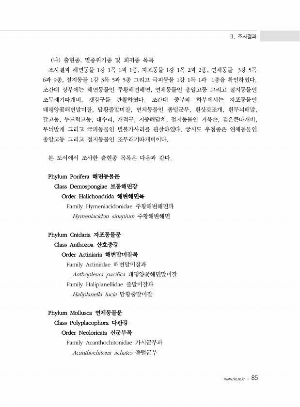 Ⅱ. 조사결과 www.nie.re.kr ? 85 나 출현종, 멸종위기종 및 희귀종 목록 조사결과 해면동물 1강 1목 1과 1종, 자포동물 1강 1목 2과 2종, 연체동물 3강 5목 6과 9종, 절지동물 1강 3목 5과 5종 그리고 극피동물 1강 1목 1과 1종을 확인하였다. 조간대 상부에는 해면동물인 주황해변해면, 연체동물인 총알고둥 그리고 절지동물인 조무래기따개비, 갯강구를 관찰하였다. 조간대 중부와 하부에서는 자포동물인 태평양꽃해변말미잘, 담황줄말미잘, 연체동물인 좀털군부, 흰삿갓조개, 흰무늬배말, 갈고둥, 두드럭고둥, 대수리, 개적구, 지중해담치, 절지동물인 거북손, 검은큰따개비, 무늬발게 그리고 극피동물인 별불가사리를 관찰하였다. 궁시도 우점종은 연체동물인 총알고둥 그리고 절지동물인 조무래기따개비이다...