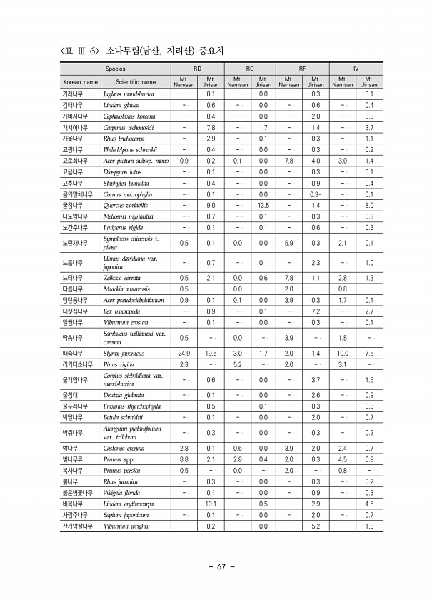 67 Species RD RC RF IV Korean name Scientific name Mt. Namsan Mt. Jirisan Mt. Namsan Mt. Jirisan Mt. Namsan Mt. Jirisan Mt. Namsan Mt. Jirisan 가래나무 Juglans mandshurica 0.1 0.0 0.3 0.1 감태나무 Lindera glauca 0.6 0.0 0.6 0.4 개비자나무 Cephalotaxus koreana 0.4 0.0 2.0 0.8 개서어나무 Carpinus tschonoskii 7.8 1.7 1.4 3.7 개옻나무 Rhus trichocarpa 2.9 0.1 0.3 1.1 고광나무 Philadelphus schrenkii 0.4 0.0 0.3 0.2 고로쇠나무 Acer p...
