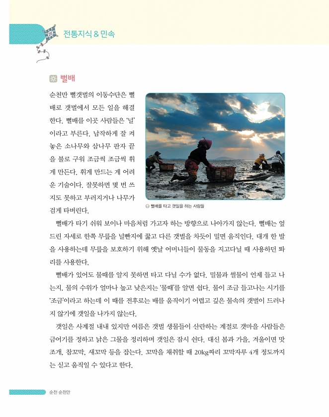 순천 순천만 뻘배 순천만 뻘갯벌의 이동수단은 뻘 배로 갯벌에서 모든 일을 해결 한다. 뻘배를 이곳 사람들은 ‘널’ 이라고 부른다. 납작하게 잘 켜 놓은 소나무와 삼나무 판자 끝 을 불로 구워 조금씩 조금씩 휘 게 만든다. 휘게 만드는 게 어려 운 기술이다. 잘못하면 몇 번 쓰 지도 못하고 부러지거나 나무가 검게 타버린다. 뻘배가 타기 쉬워 보이나 마음처럼 가고자 하는 방향으로 나아가지 않는다. 뻘배는 엎 드린 자세로 한쪽 무릎을 널빤지에 꿇고 다른 갯벌을 차듯이 밀면 움직인다. 대개 한 발 을 사용하는데 무릎을 보호하기 위해 옛날 어머니들이 물동을 지고다닐 때 사용하던 똬 리를 사용한다. 뻘배가 있어도 물때를 알지 못하면 타고 다닐 수가 없다. 밀물과 썰물이 언제 들고 나 는지, 물의 수위가 얼마나 높고 낮...
