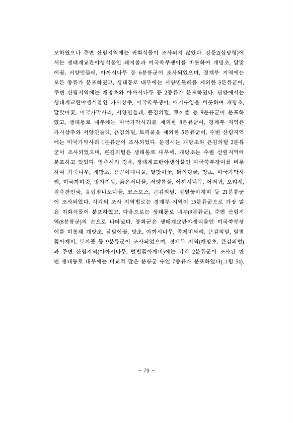 79 포하였으나 주변 산림지역에는 귀화식물이 조사되지 않았다. 강릉2 삽당령 에 서는 생태계교란야생식물인 돼지풀과 미국쑥부쟁이를 비롯하여 개망초, 달맞 이꽃, 서양민들레, 아까시나무 등 6분류군이 조사되었으며, 경계부 지역에는 모든 종류가 분포하였고, 생태통로 내부에는 서양민들레를 제외한 5분류군이, 주변 산림지역에는 개망초와 아까시나무 등 2종류가 분포하였다. 단양에서는 생태계교란야생식물인 가시상추, 미국쑥부쟁이, 애기수영을 비롯하여 개망초, 달맞이꽃, 미국가막사리, 서양민들레, 큰김의털, 토끼풀 등 9분류군이 분포하 였고, 생태통로 내부에는 미국가막사리를 제외한 8분류군이, 경계부 지역은 가시상추와 서양민들레, 큰김의털, 토끼풀을 제외한 5분류군이, 주변 산림지역 에는 미국가막사리 1분류군이 조사되었다....